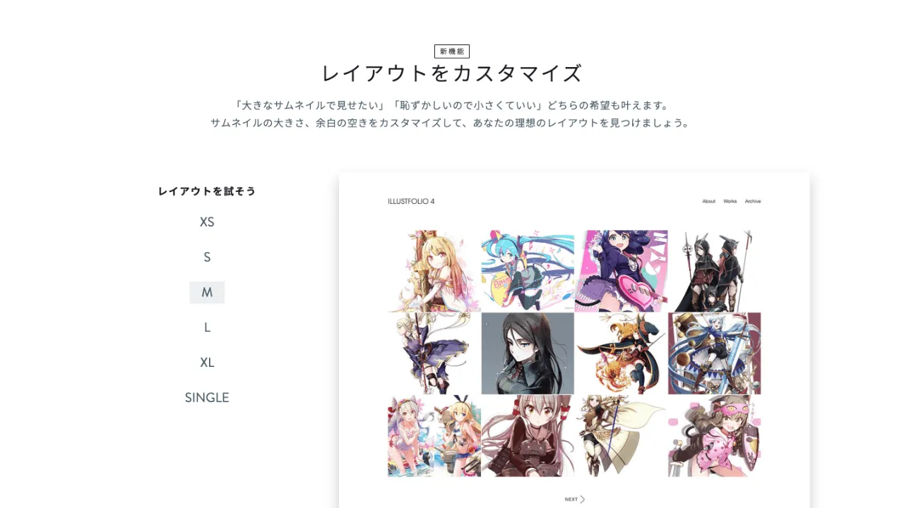 「Illustfolio 4」では、「自分の描いた絵が大きなサムネイルになるのが恥ずかしい人が一定数いるのではないか」という仮説のもと、サムネイルサイズや余白の量まで細かくカスタマイズできる機能を追加。2012年のリリース以来ずっと利用者の状況を観測し続けていることが、こうしたアイデアに結びついています。