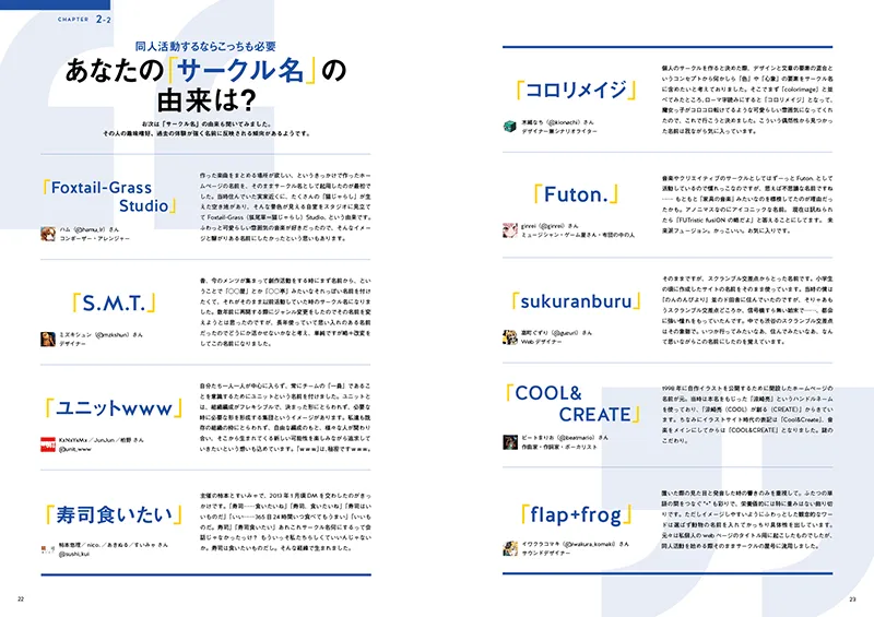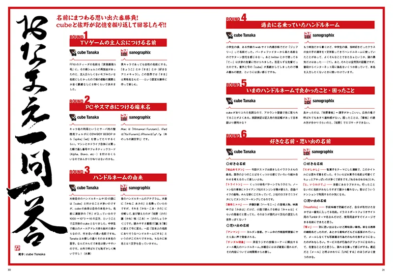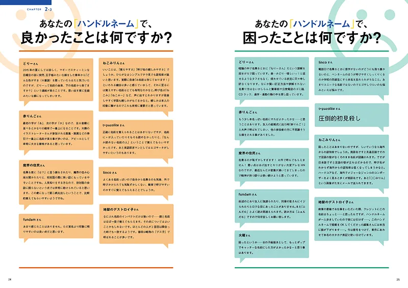 ハンドルネームの由来や名前にまつわるエピソードなど、計18組へのインタビュー。