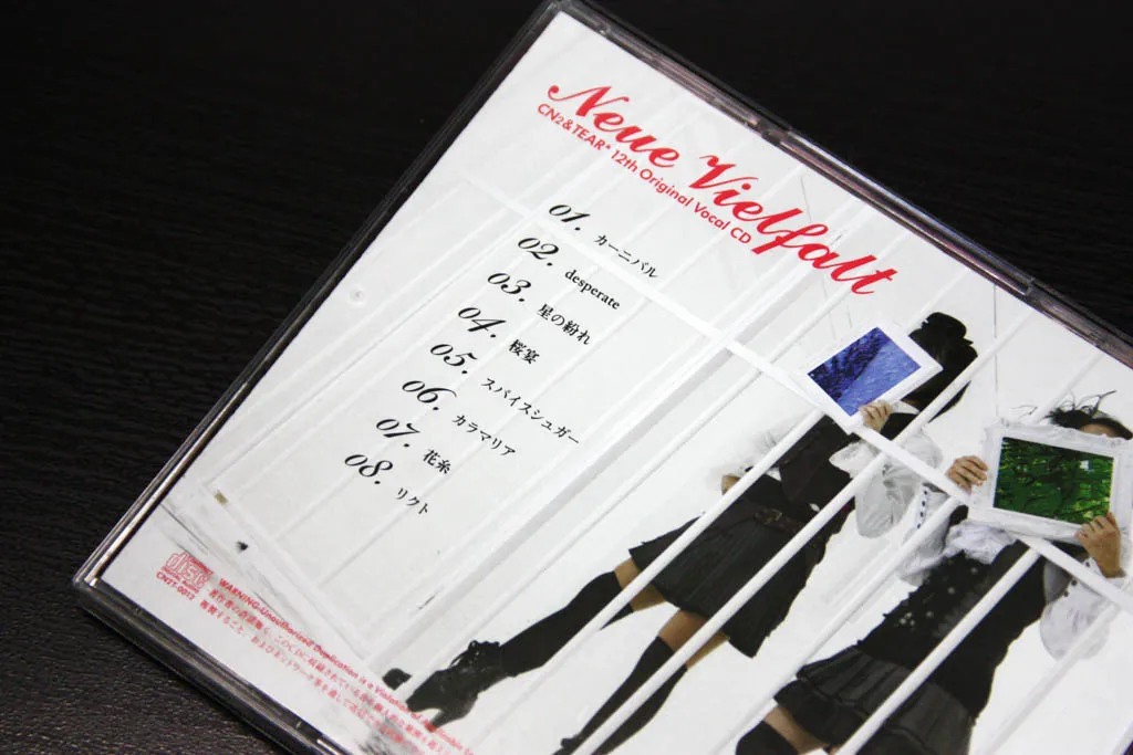 Neue Vielfalt CL: CN2&TEAR* Release: 2011/10 Neue Vielfalt Cover Design CL: CN2&TEAR* Release: 2011/10 オリジナルボーカルCDのジャケット、ロゴ、レーベル、ライナーノーツのデザイン。写真を活かしつつ、差し色に赤。 Back