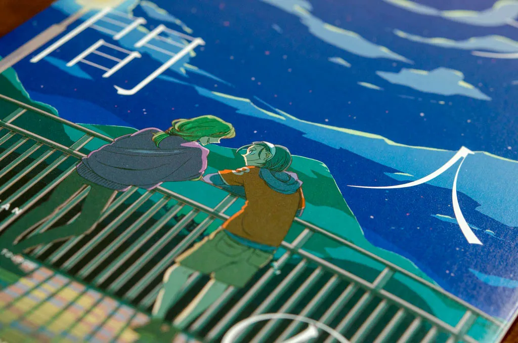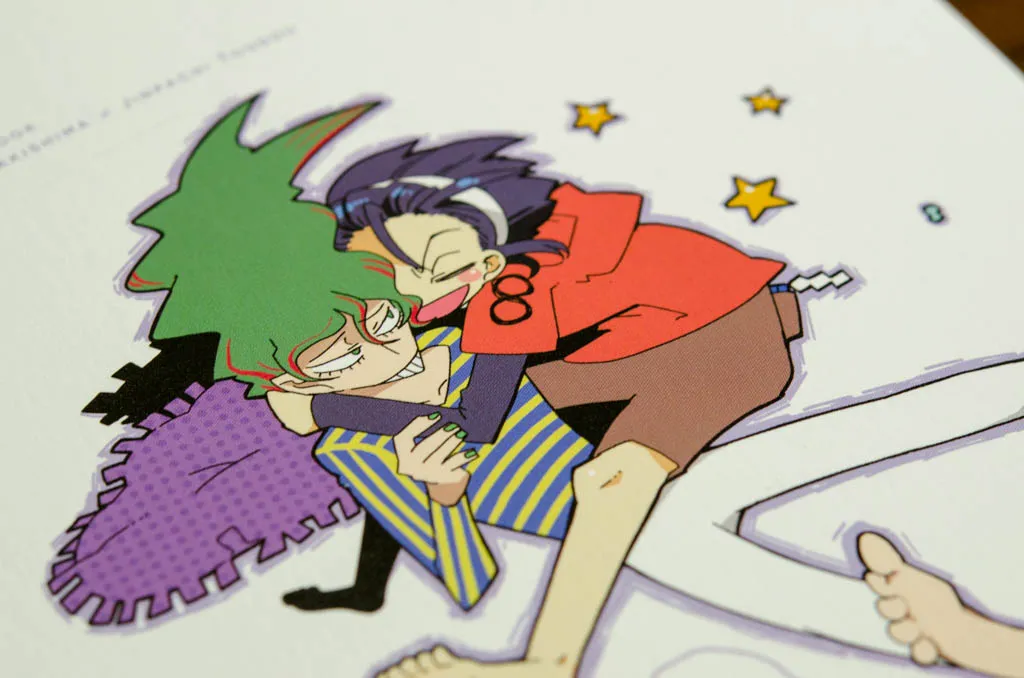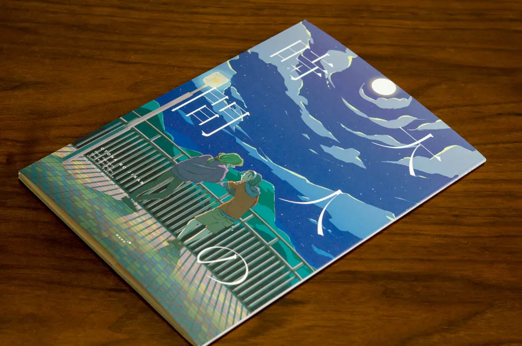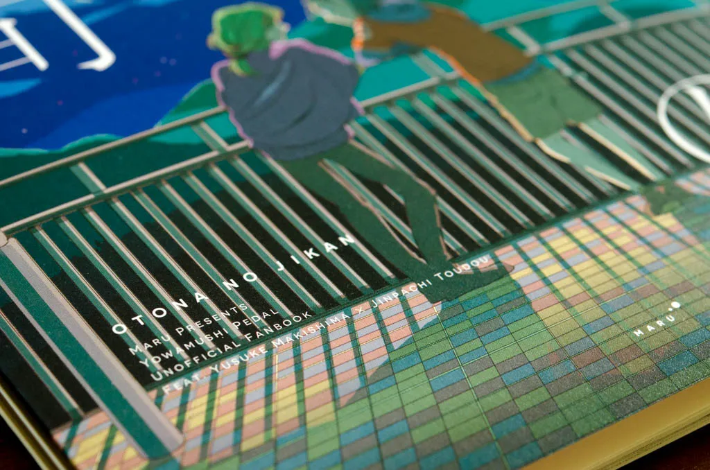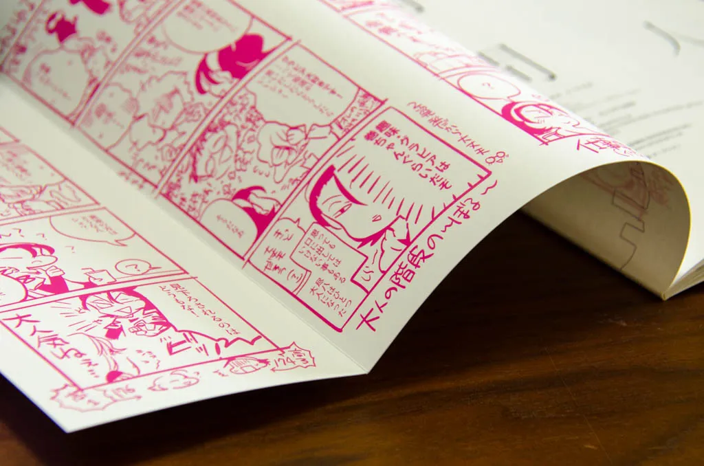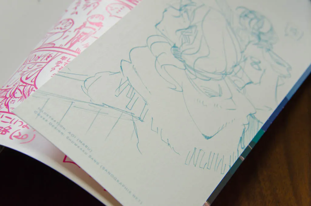 表紙にはやや厚めの紙をPP加工せず使用。フランス製本で横に表紙が伸びることを利用して、表2,3でおまけ4コマが読める。
